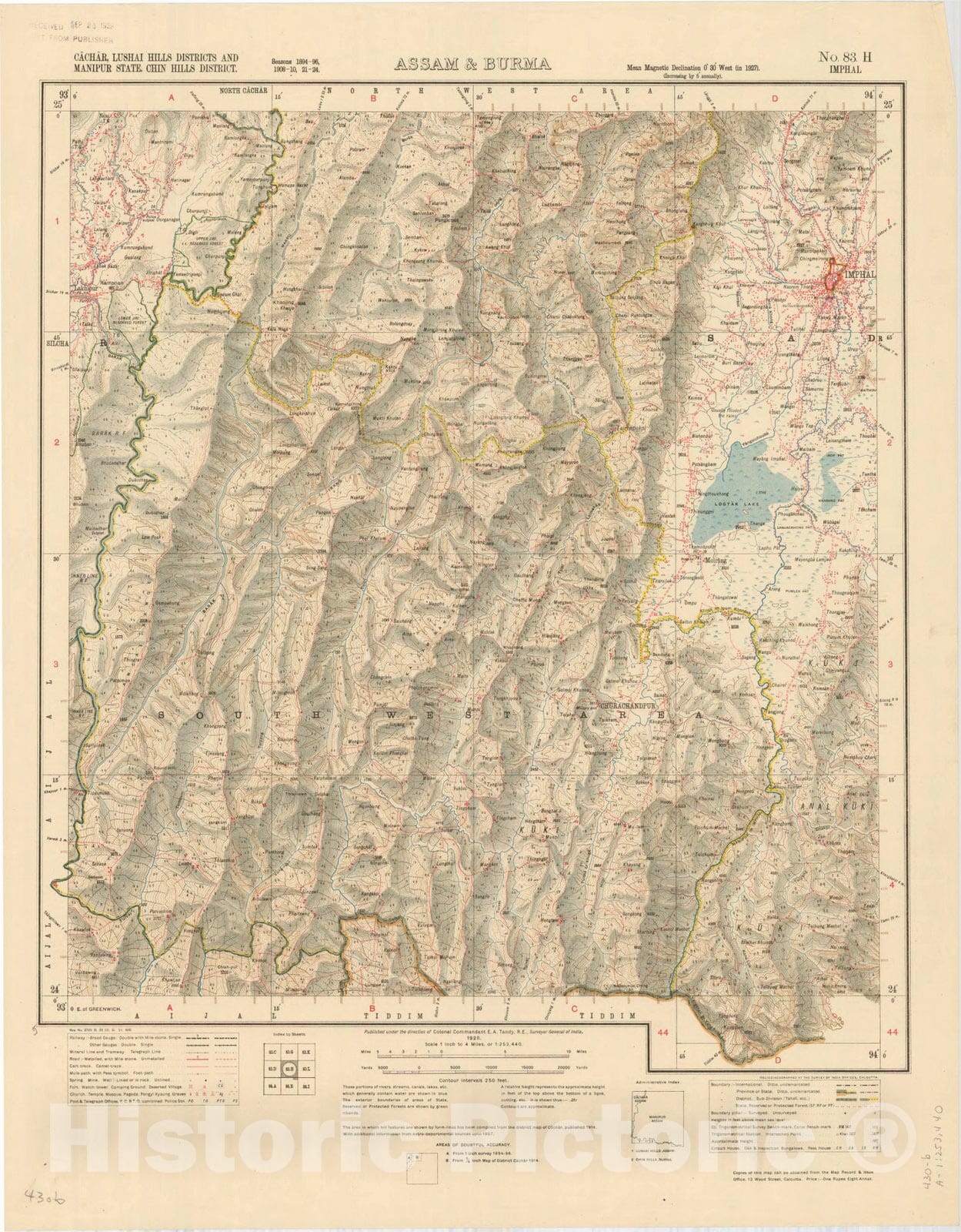 Map : Cachar, Lushai Hills Districts and manipur State, Chin Hills District, Assam & Burma, No. 83 H Imphal 1928, India 1:253,440, Antique Vintage Reproduction