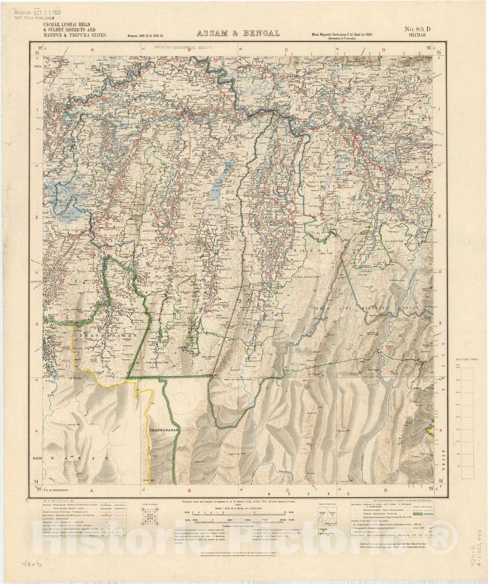 Map : Cachar, Lushai Hills & Sylhet Districts and Manipur & Tripura States, Assam & Bengal, No. 83 D Silchar 1921, India 1:253,440, Antique Vintage Reproduction