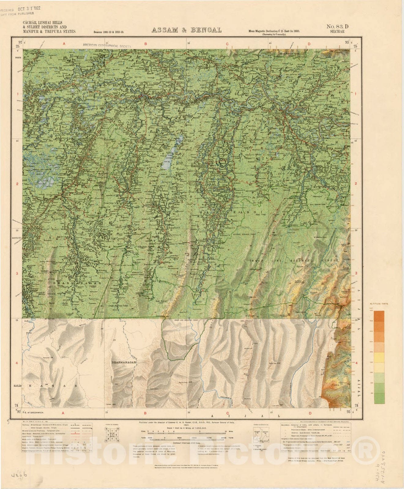 Map : Cachar, Lushair Hills & Sylhet Districts and Manipur & Tripura States, Assam & Bengal, No. 83 D Silchar 1921, India 1:253,440, Antique Vintage Reproduction