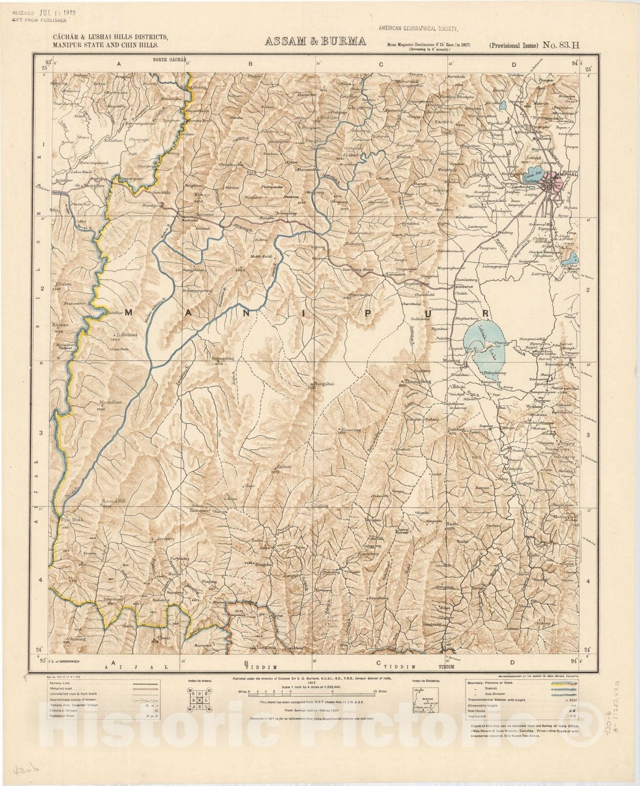 Map : Cahcar & Lushai Hills Districts, Manipur State and Chin Hills, Assam & Burma, No. 83 H 1917, India 1:253,440, Antique Vintage Reproduction