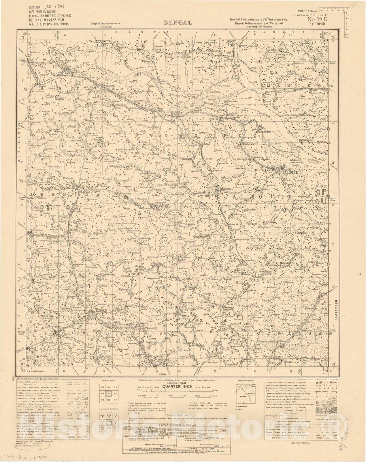 Map : Dacca, Faridpur, Jesore, Khulna, Mymensingh, Nadia & Pabna Districts, Bengal, No. 79 E 1943, India 1:253,440, Antique Vintage Reproduction