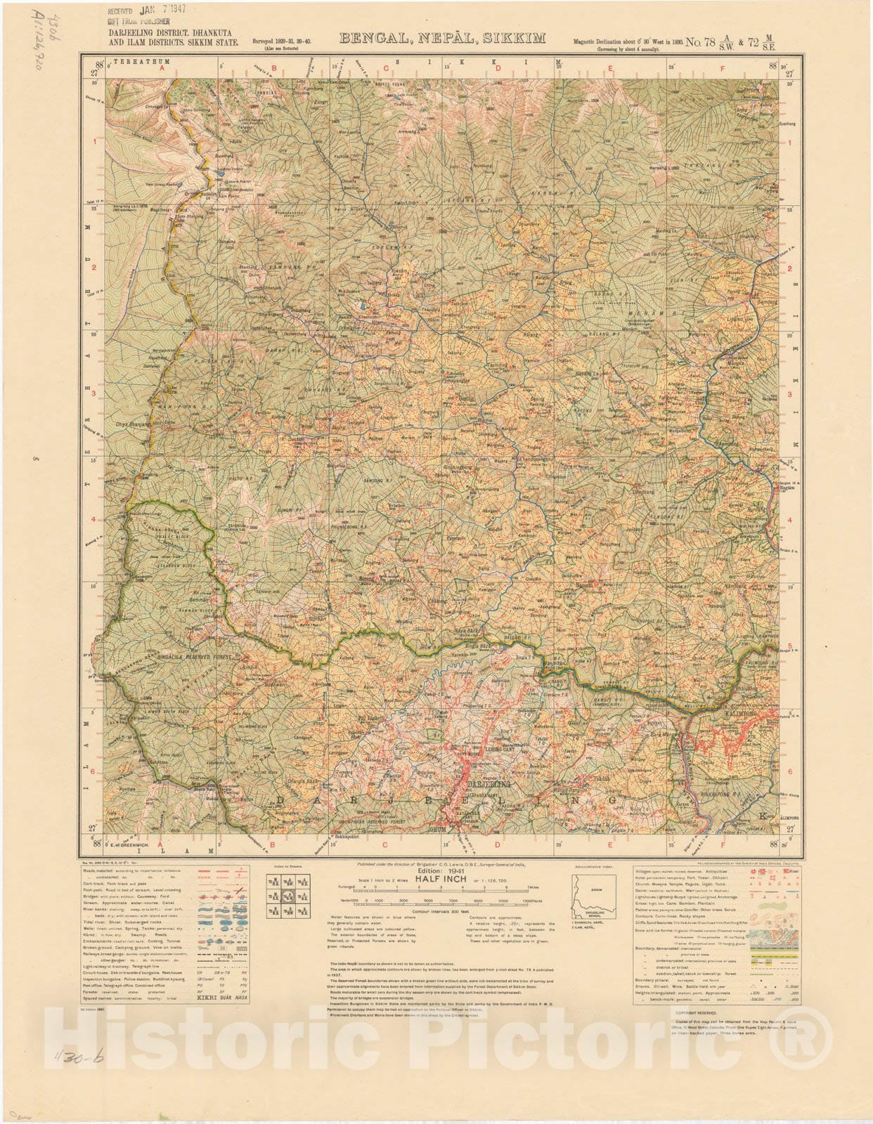 Map : Darjeeling District, Khankuta and Ilam Districts, Sikkim State, Bengal, Nepal, Sikkim, No. 78 A/S.W. & 72 M/S.E. 1941, India and adjacent countries