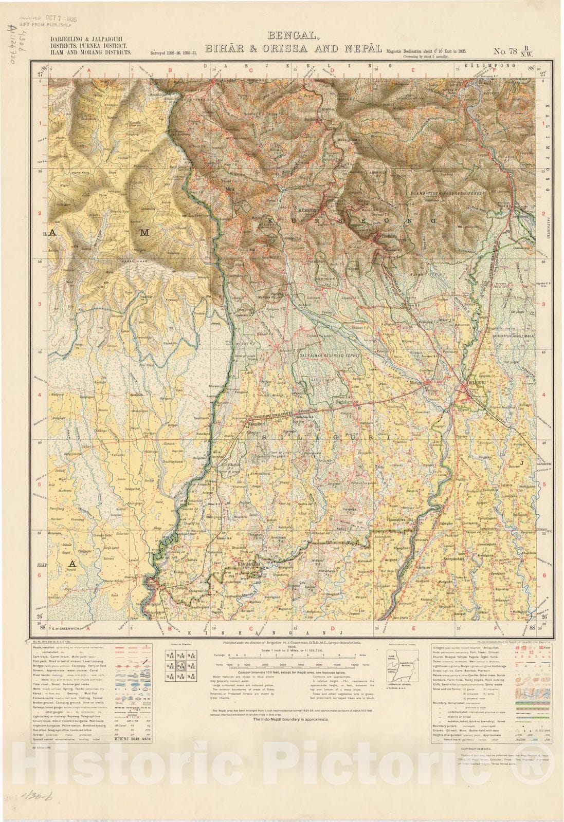 Map : Darjeeling & Jalpaiguri Districts, Purnea District, Ilam and Morang District, Bengal, Bihar & Orissa and Nepal, No. 78 B/N.W.1934, India and adjacent countries