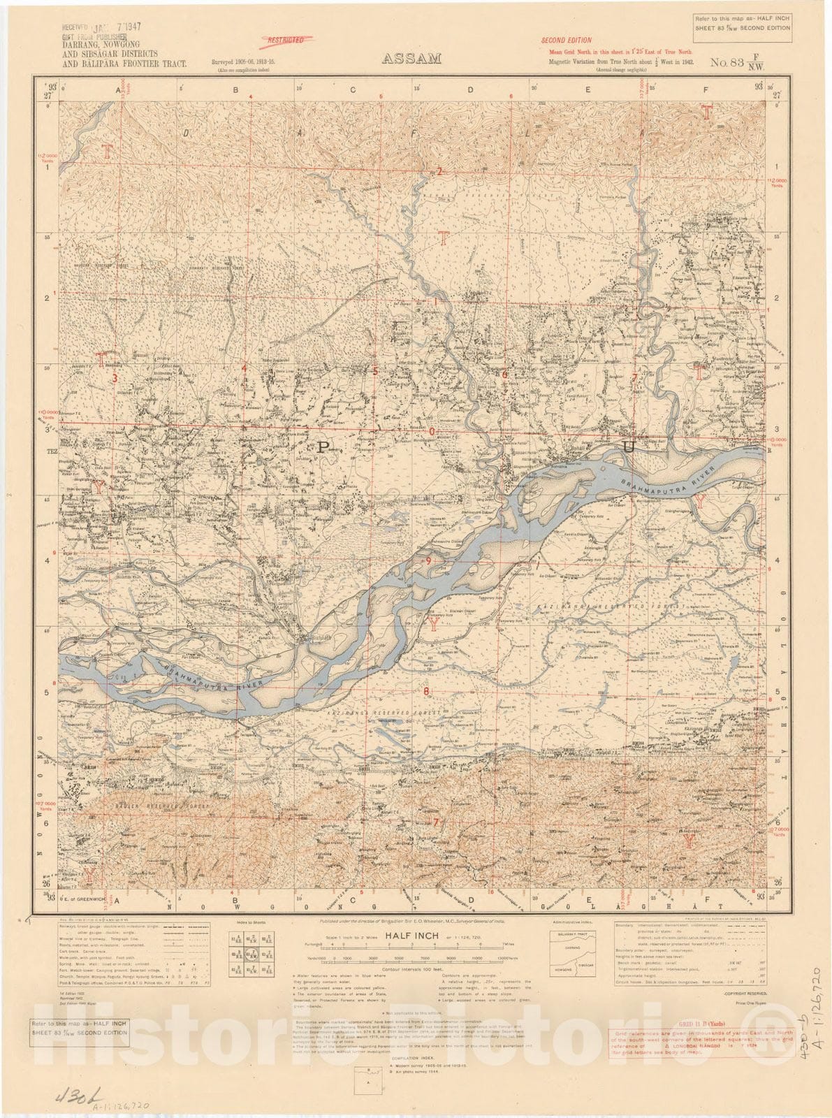 Map : Darrang, Nowgong and Sibsagar Districts and Balipara Frontier Tract, Assam, No. 83 F/N.W. 1945, India and adjacent countries, Antique Vintage Reproduction