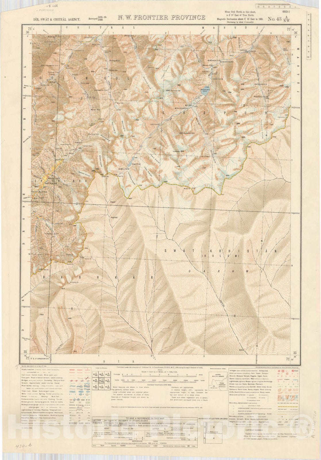 Map : Dir, Swat & Chitral Agency, N.W. Frontier Province, No. 43 A/N.W. 1933, India and adjacent countries, Antique Vintage Reproduction