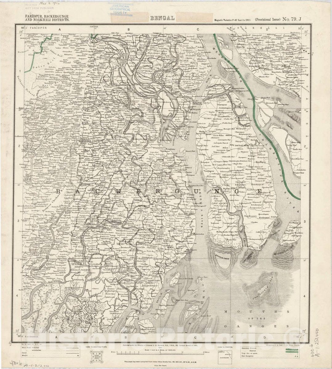 Map : Faridpur, Backergunge and Noakhali Districts, Bengal, No. 79 J 1911, India 1:253,440, Antique Vintage Reproduction