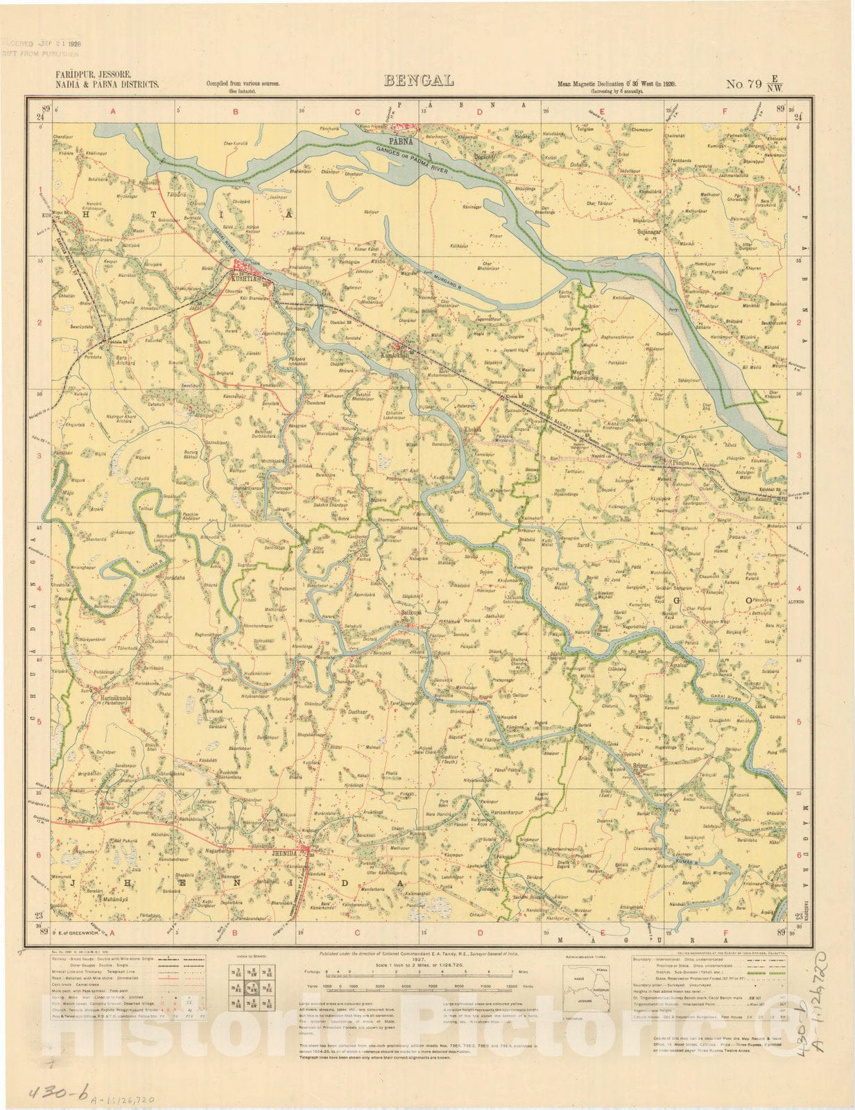 Map : Faridpur, Jessore, Nadia & Pabna Districts, Bengal, No. 79 E/N.W. 1927, India and adjacent countries, Antique Vintage Reproduction