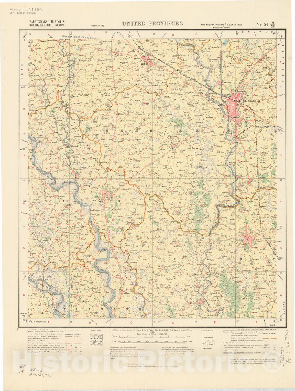 Map : Farrukhabad, Hardoi & Shahjahanpur Districts, United Provinces, No. 54 M/N.E. 1923, India and adjacent countries, Antique Vintage Reproduction