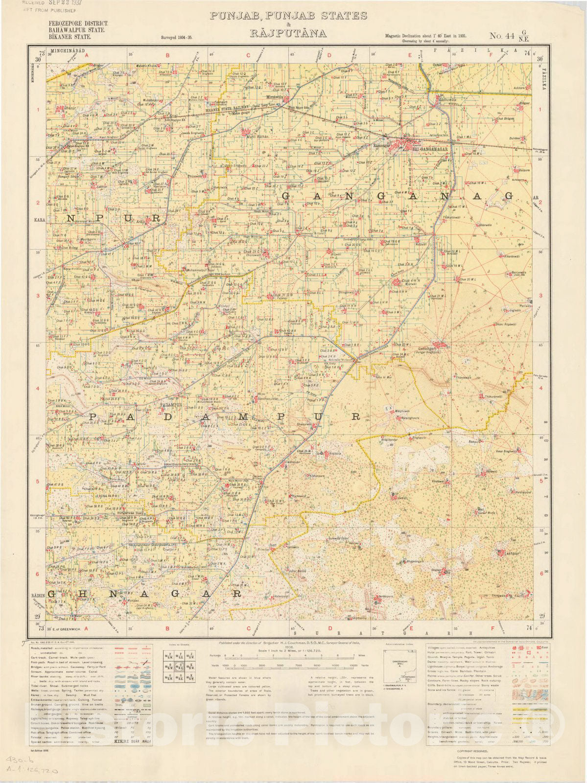 • Map : Ferozepore District, Bahawalpur State, Bikaner State, Punjab, Punjab States & Rajputana, No. 44 G/N.E. 1936, India 1:126,720, Antique Vintage Reproduction