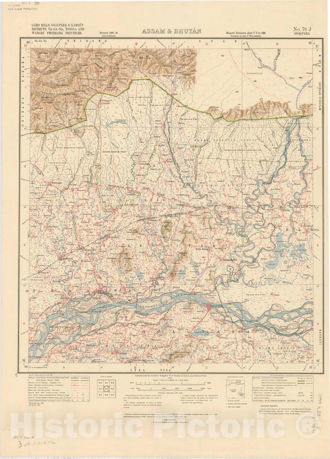 Historic Map : Garo Hills, Goalpara & Kamrup Districts, Ta-Ga-Na, Tongsa and Wangdu Phodrang Provinces, Assam & Bhutan, No. 78 J 1931, India 1:253,440, Antique Vintage Reproduction