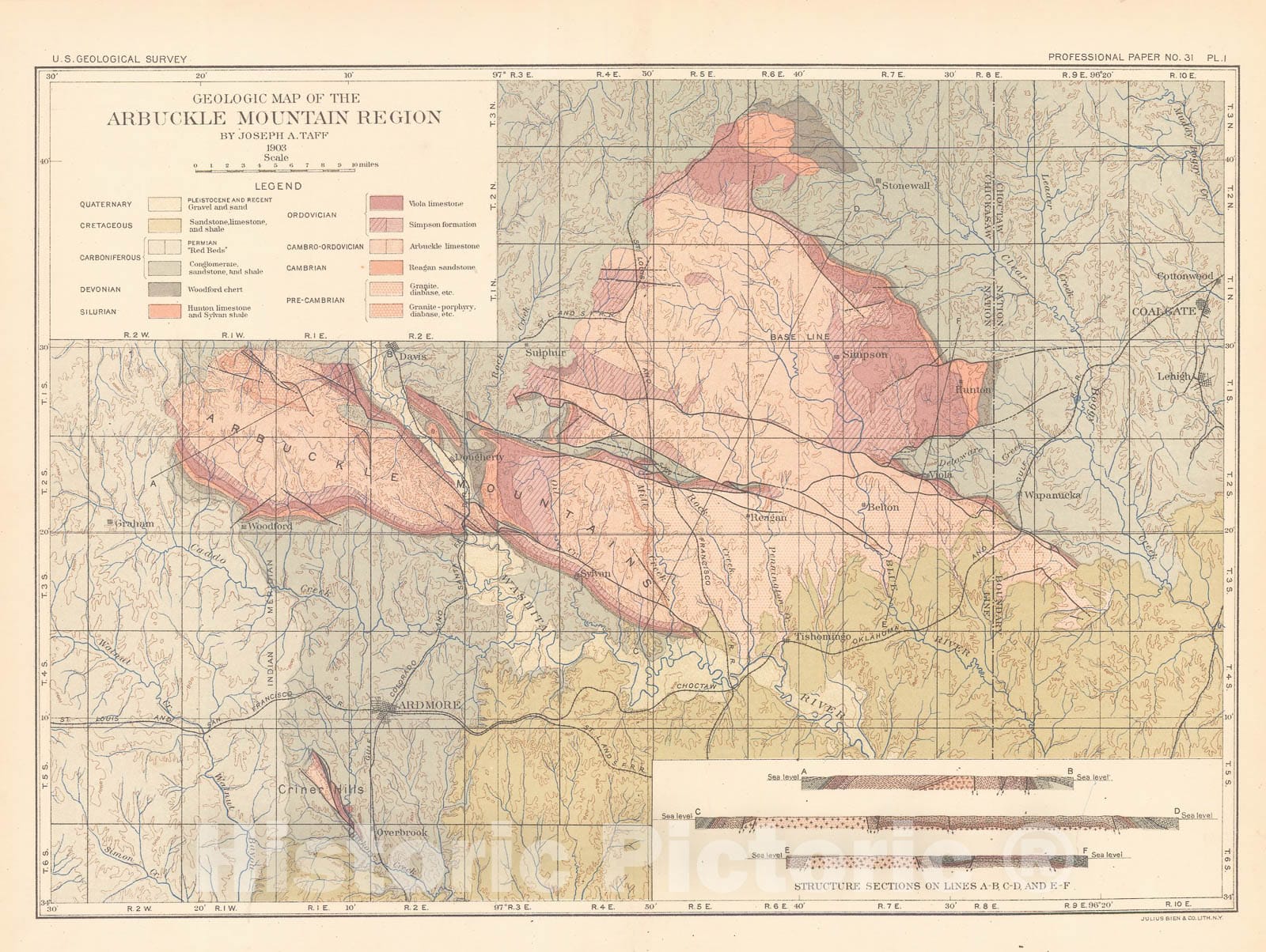 Map : Geology of the Arbuckle and Wichita Mountains in Indian Territory and Oklahoma, with an appendix on reported ore deposits of the Wichita Mountains, 1904 Cartography Wall Art :