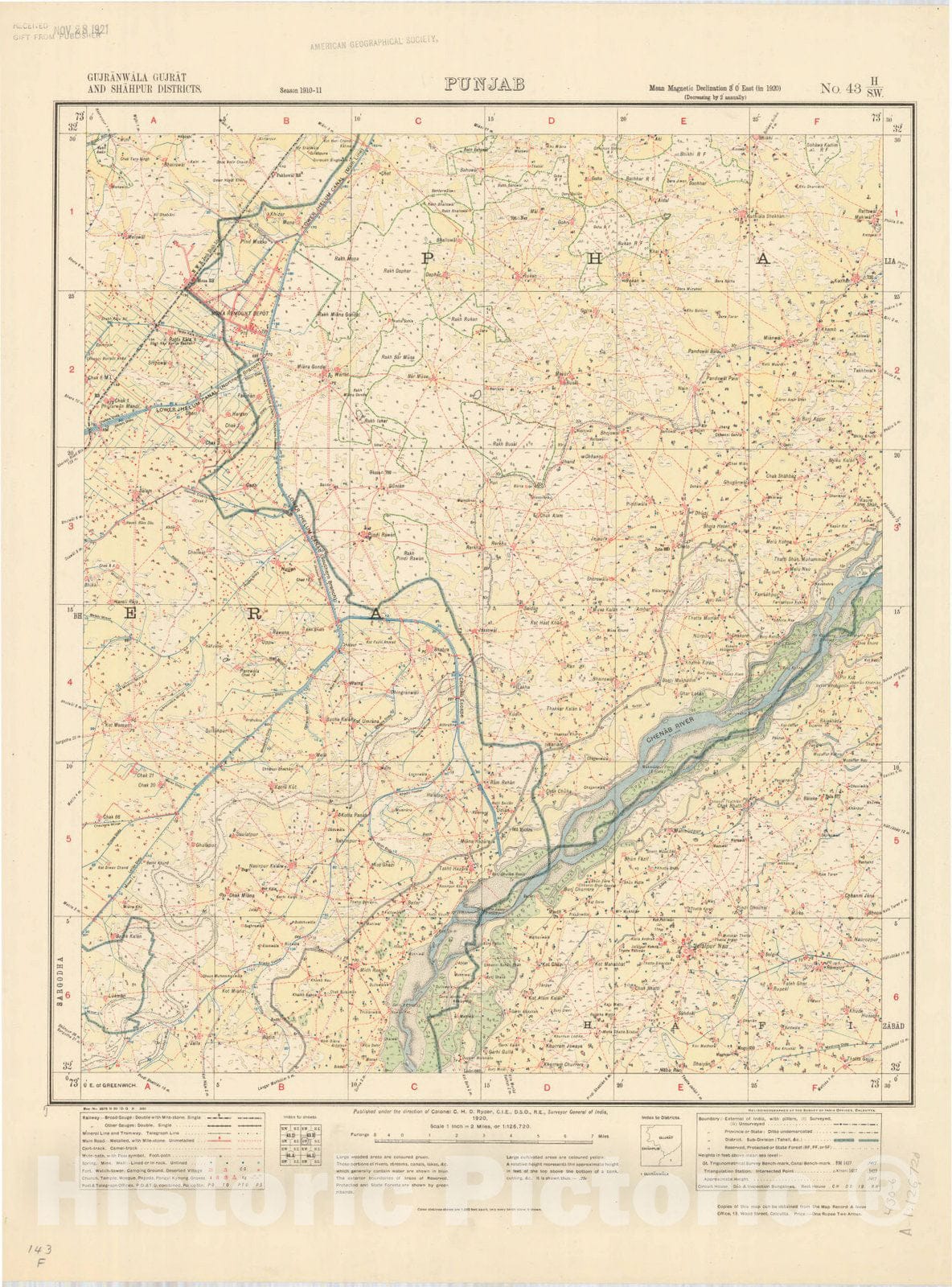 Map : Gujranwala Gujrat and Shahpur Districts, Punjab, No. 43 H/S.W. 1920, India and adjacent countries, Antique Vintage Reproduction