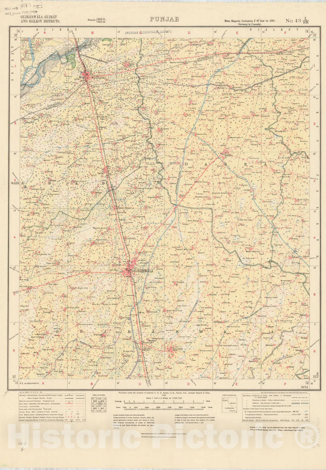 Map : Gujranwala, Gujrat and Sialkot Districts, Punjab, No. 43 L/S.W. 1921, India 1:126,720, Antique Vintage Reproduction