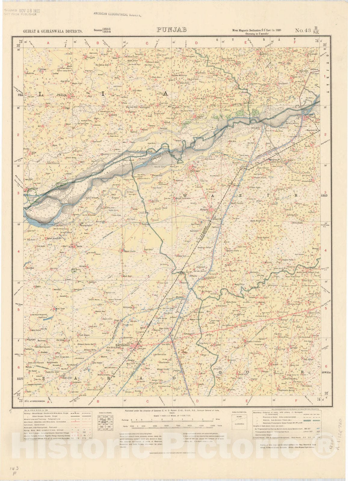 Map : Gujrat & Gujranwala Districts, Punjab, No. 43 H/S.E. 1920, India and adjacent countries, Antique Vintage Reproduction