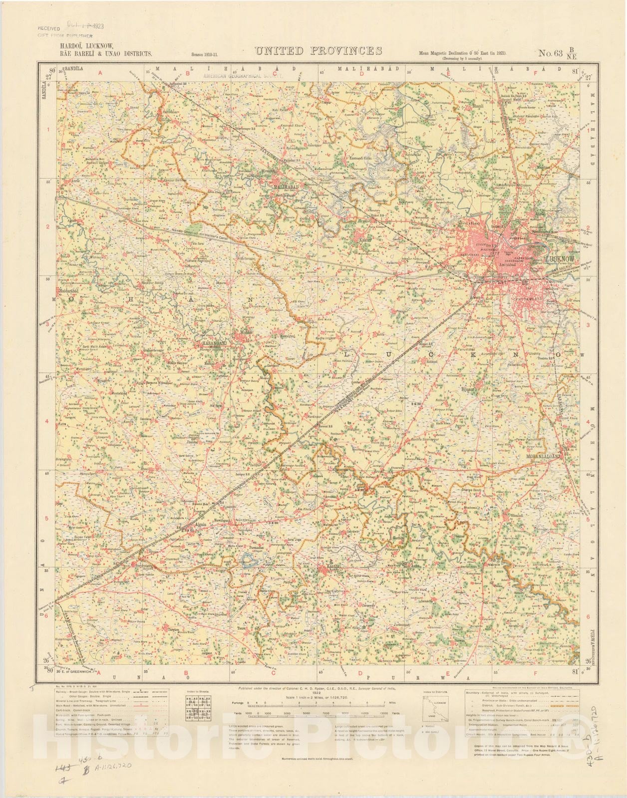 Map : Hardoi, Lucknow, Rae Bareli & Unao Districts, United Provinces, No. 63 B/N.E. 1922, India and adjacent countries, Antique Vintage Reproduction