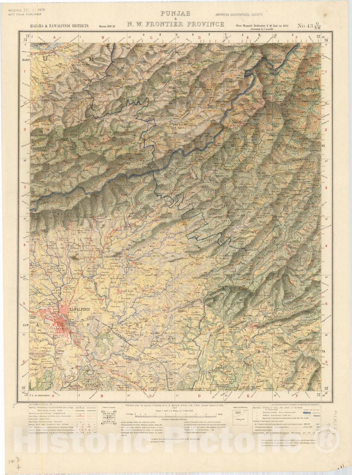 Map : Hazara & Rawalpindi Districts, Punjab 7 N.W. Frontier Province, No. 43 G/N.W. 1917, India and adjacent countries, Antique Vintage Reproduction