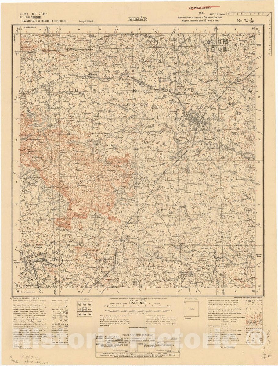 Map : Hazaribagh, & Manbhum Districts, Bihar, No. 73 I/S.W. 1929, India and adjacent countries, Antique Vintage Reproduction