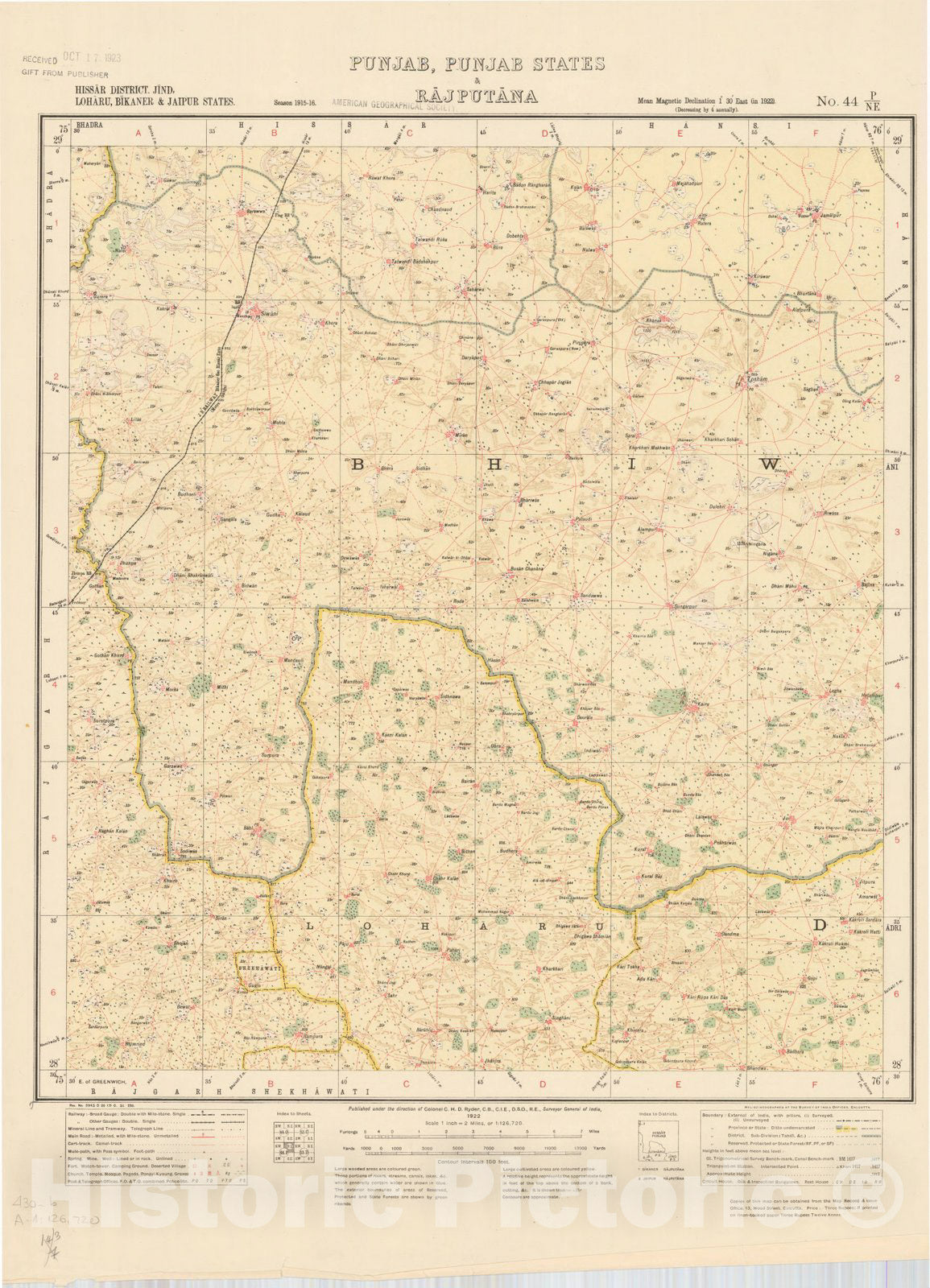 Historic Map : Hissar District, Jind, Loharu, Bikaner & Jaipur States, Punjab, Punjab States, & Rajputana No. 44 P/N.E. 1922, India and adjacent countries, Antique Vintage Reproduction