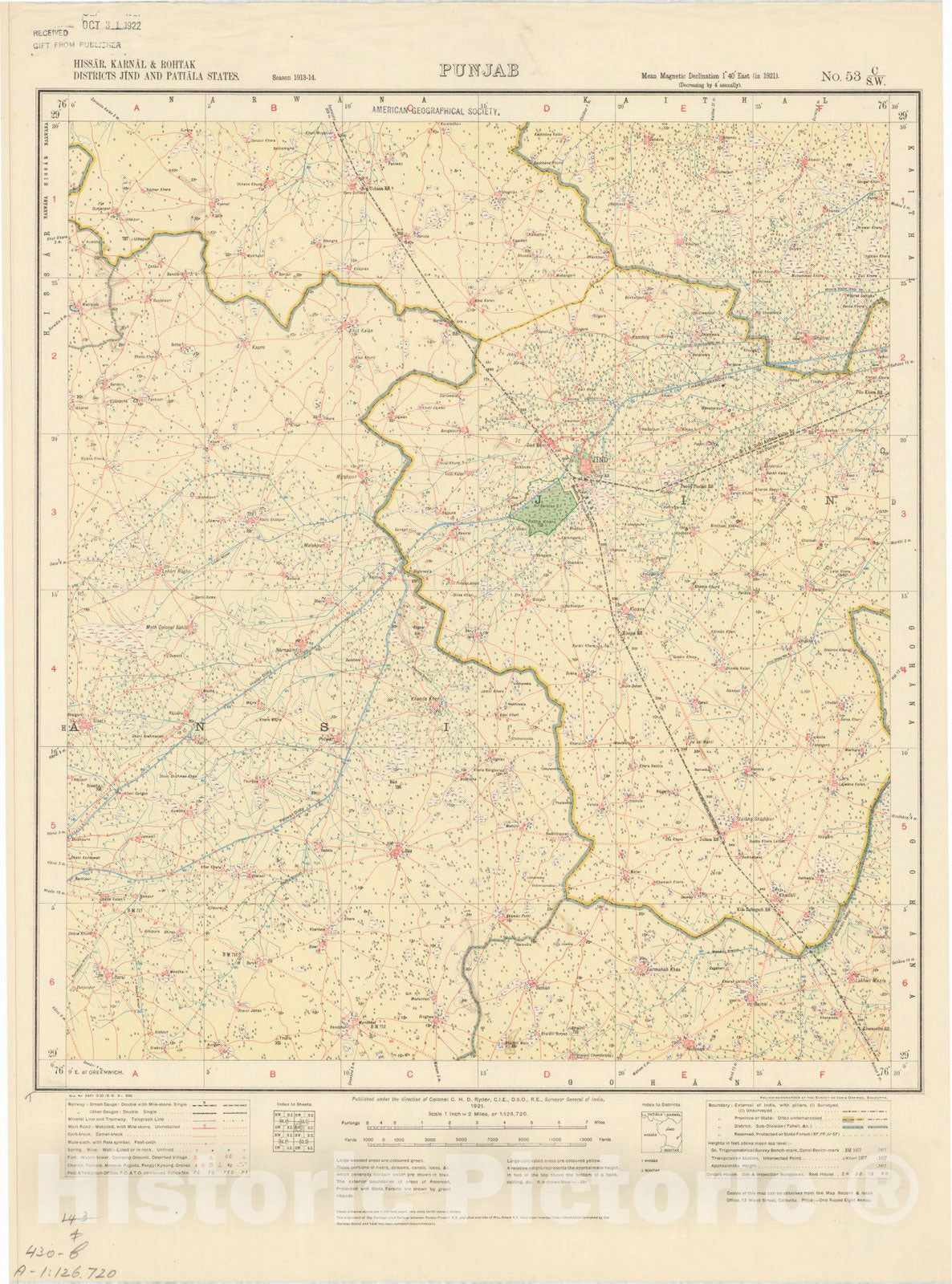 Map : Hissar, Karnal & Rohtak Districts, Jind and Patiala States, Punjab, No. 53 C/S.W. 1921, India and adjacent countries, Antique Vintage Reproduction