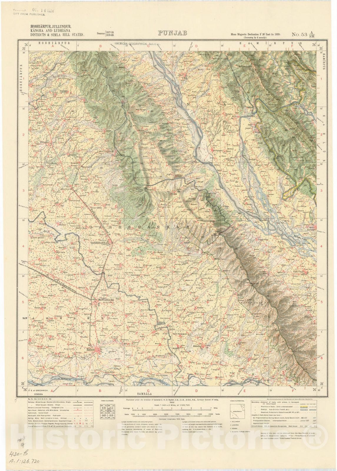 Map : Hoshiarpur, Jullundur, Kangra and Ludhiana Districts & Simla Hill States, Punjab No. 53 A/S.W. 1922, India and adjacent countries, Antique Vintage Reproduction