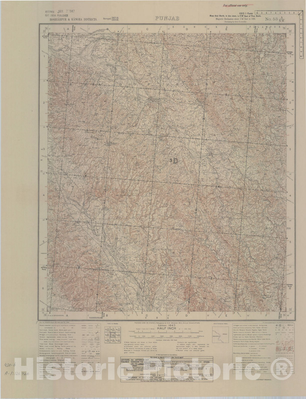 Map : Hoshiarpur & Kangra Districts, Punjab, No. 53 A/N.W. 1943, India and adjacent countries, Antique Vintage Reproduction