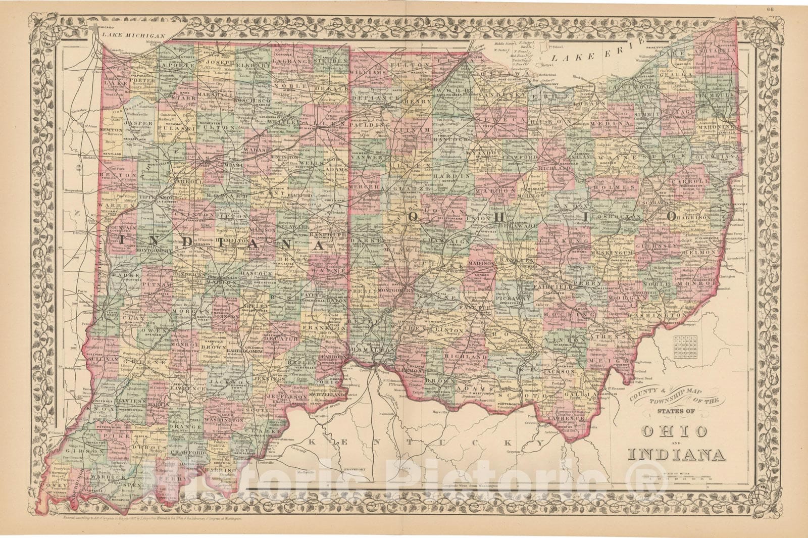 Historic Map : Indiana & Ohio 1882 , Mitchell's New General Atlas , Vintage Wall Art