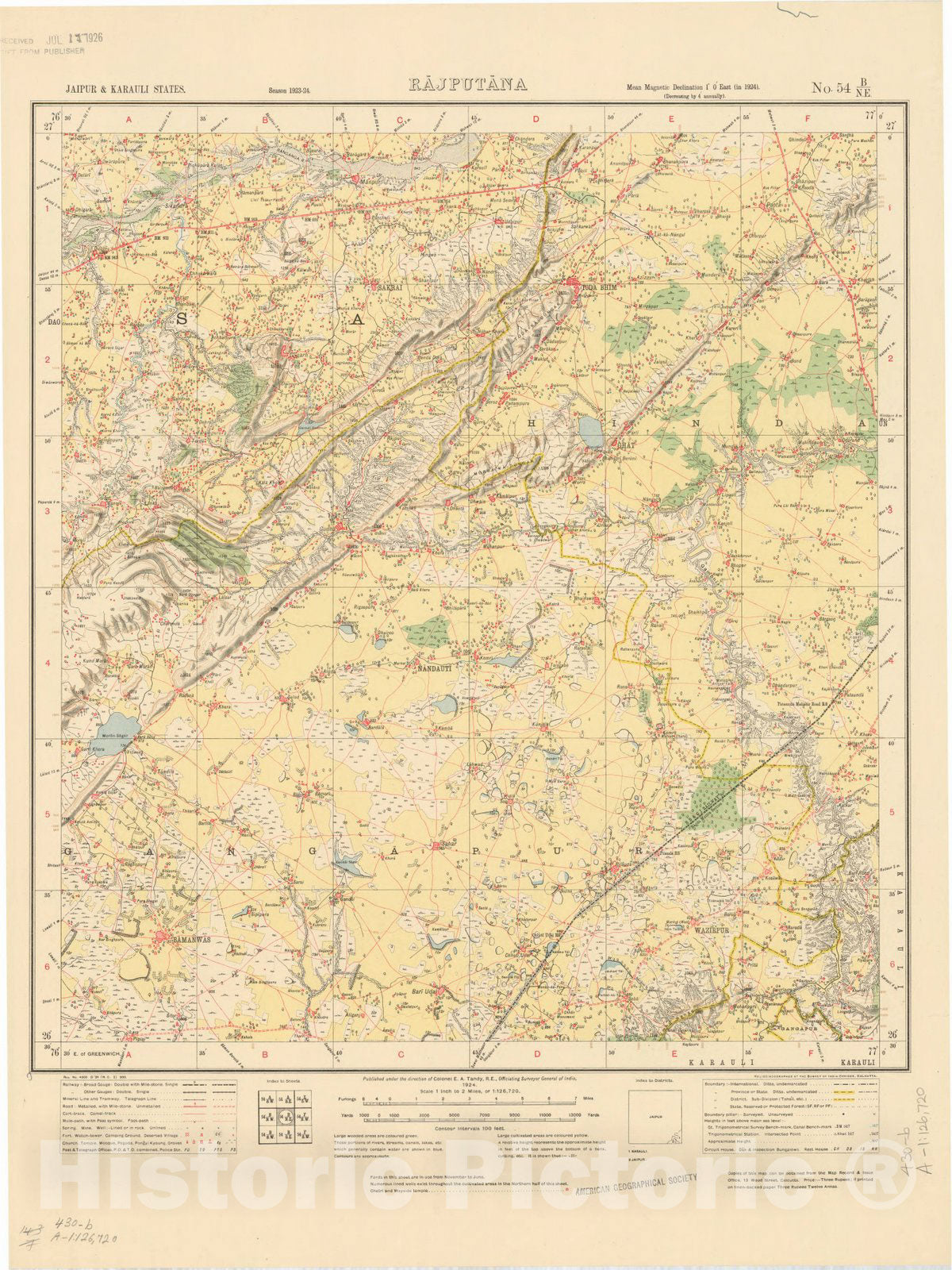 Map : Jaipur & Karauli States, Rajputana, No. 54 B/N.E. 1924, India and adjacent countries, Antique Vintage Reproduction
