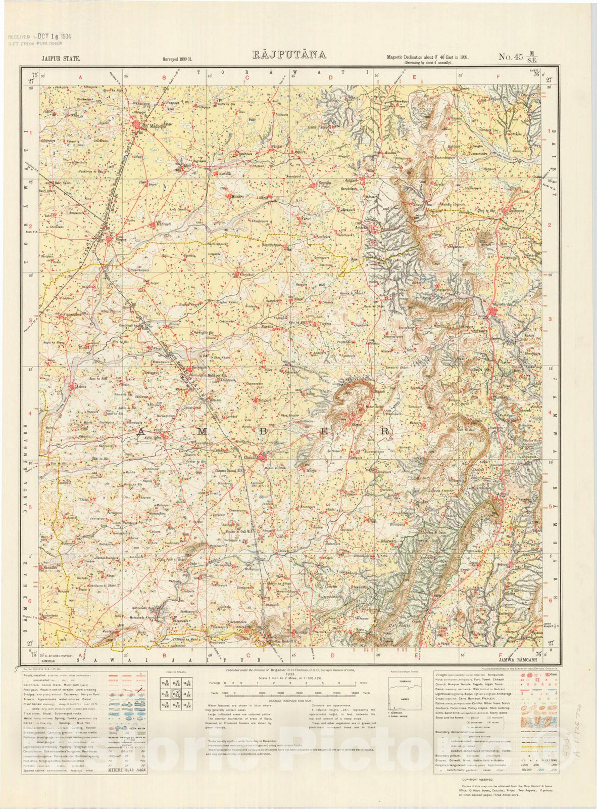Map : Jaipur State, Rajputana, No. 45 M/S.E. 1933, India and adjacent countries, Antique Vintage Reproduction