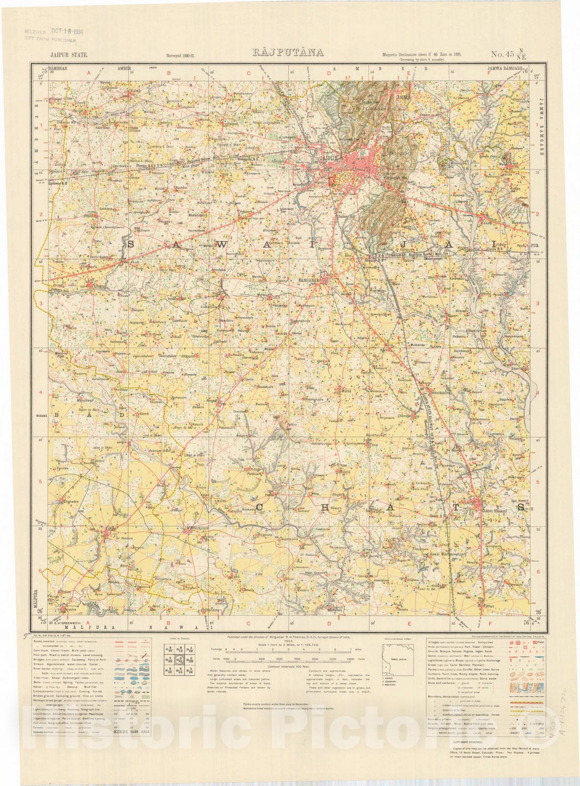 Map : Jaipur State, Rajputana, No. 45 N/N.E. 1933, India and adjacent countries, Antique Vintage Reproduction
