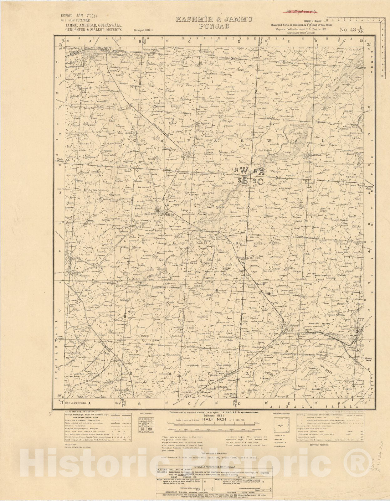 Map : Jammu, Amritsar, Gufranwala, Gurdaspur & Sialkot Districts, Kashmir & Jammu, Punjab No. 43 L/S.E. 1943, India 1:126,720, Antique Vintage Reproduction