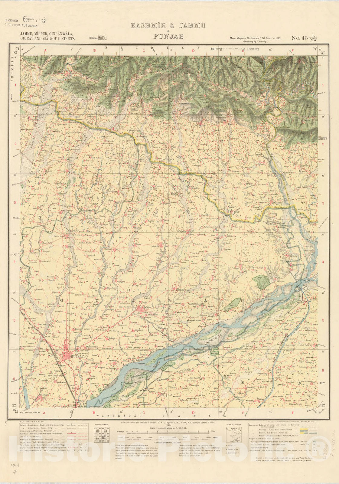 Map : Jammu, Mirpur, Gufranwala, Gufrat and Sialkot Districts, Kashmir & Jammu & Punjab No. 43 L/N.W. 1921, India 1:126,720, Antique Vintage Reproduction