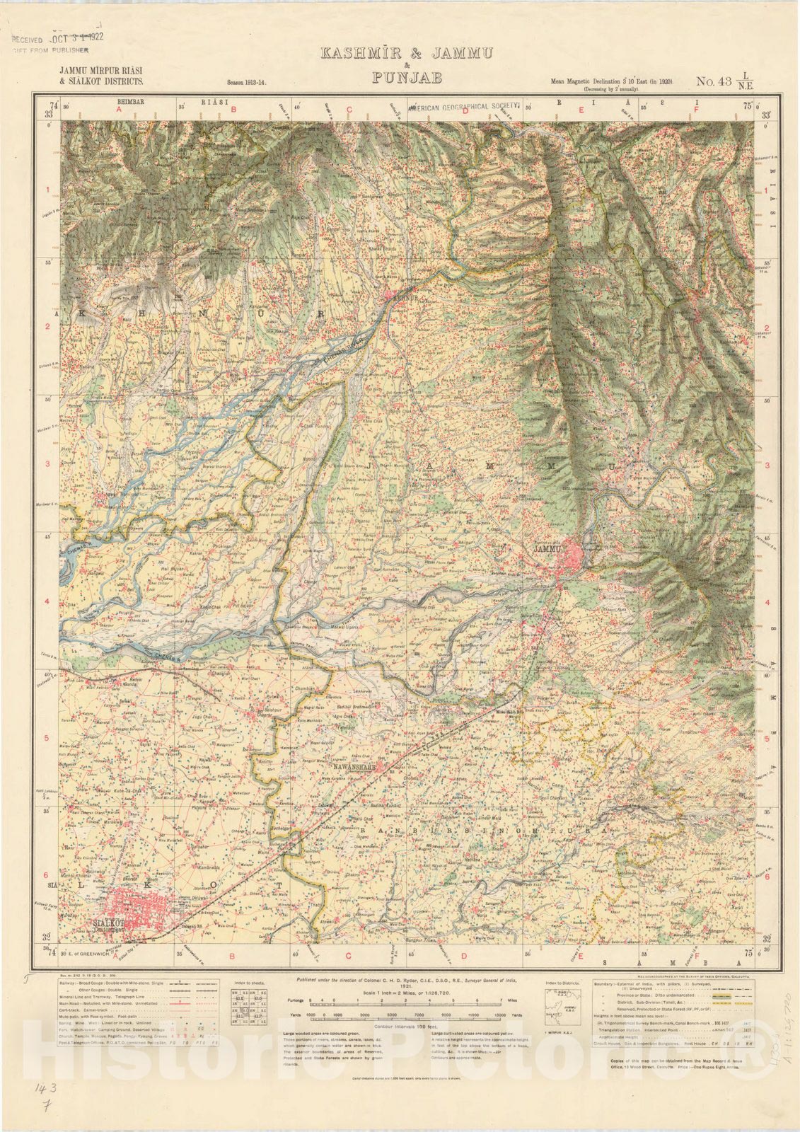Map : Jammu Mirpur Riasi & Sialkot Districts, Kashmir & Jammu & Punjab No. 43 L/N.E. 1921, India and adjacent countries, Antique Vintage Reproduction