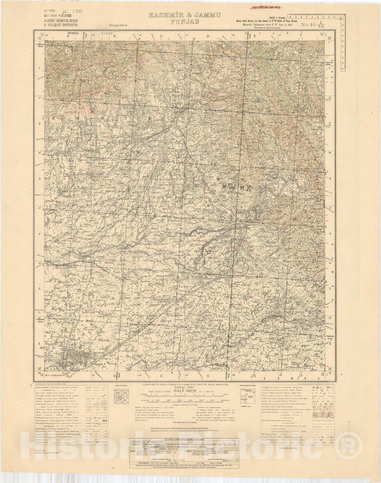 Map : Jammu Mirpur Riasi & sialkot Districts, Kashmir & Jammu, Punjab No. 43 L/N.E. 1943, India and adjacent countries, Antique Vintage Reproduction