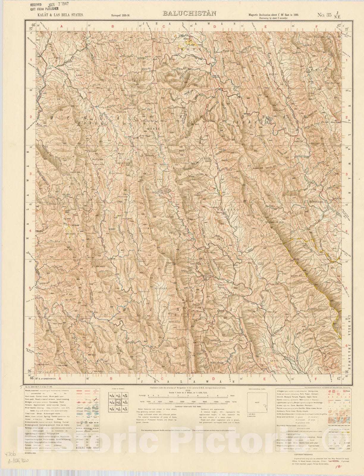Map : Kalat & Bela States, Baluchistan, No. 35 J/N.E. 1938, India and adjacent countries, Antique Vintage Reproduction