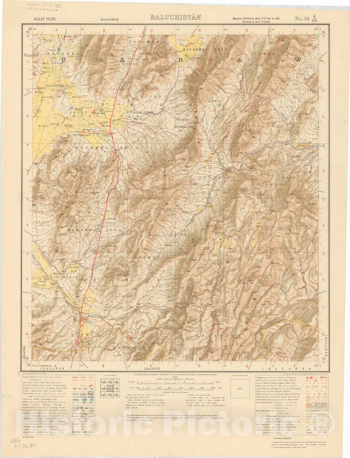 Map : Kalat State, Baluchistan, No. 34 K/S.E. 1934, India and adjacent countries, Antique Vintage Reproduction