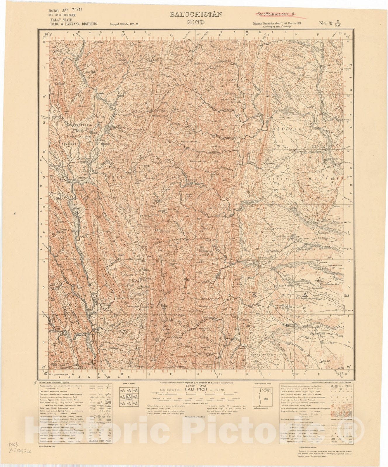 Map : Kalat State, Dadu & Larkana Districts, Baluchistan, Sind, No.35 M/S.W. 1942, India and adjacent countries, Antique Vintage Reproduction