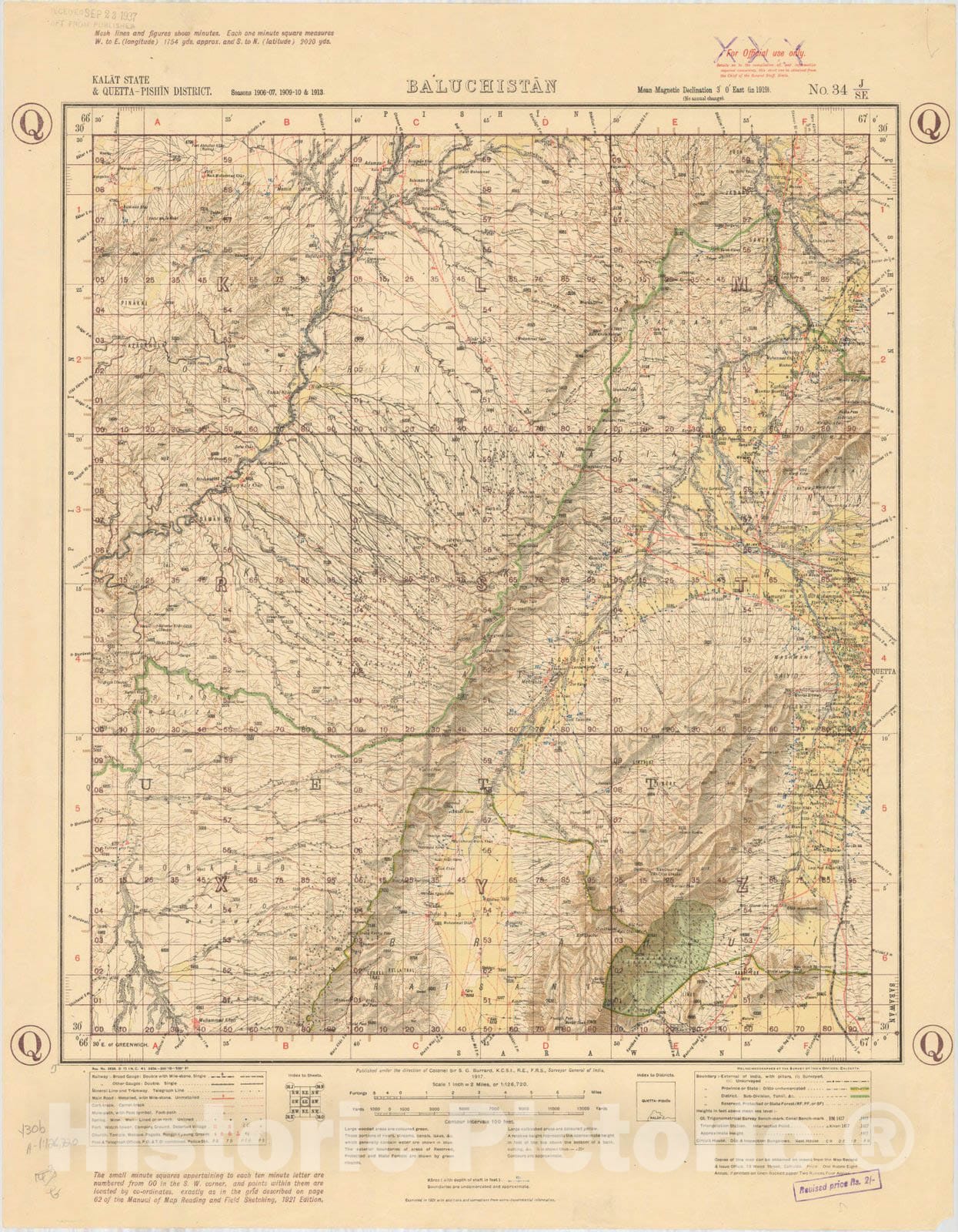 • .Map : Kalat State & Quetta-Pishin District, Baluchistan, No. 34 J/S.E. 1921, India and adjacent countries, Antique Vintage Reproduction