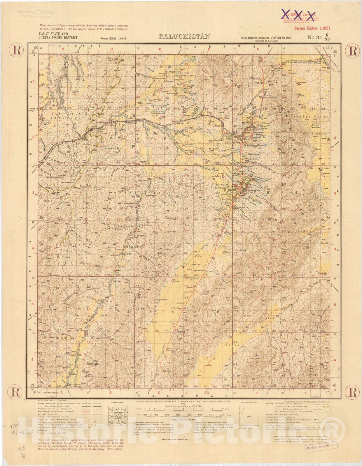 Map : Kalat State and Quetta-Pishin District, Baluchistan, No. 34 K/N.E. 1921, India and adjacent countries, Antique Vintage Reproduction