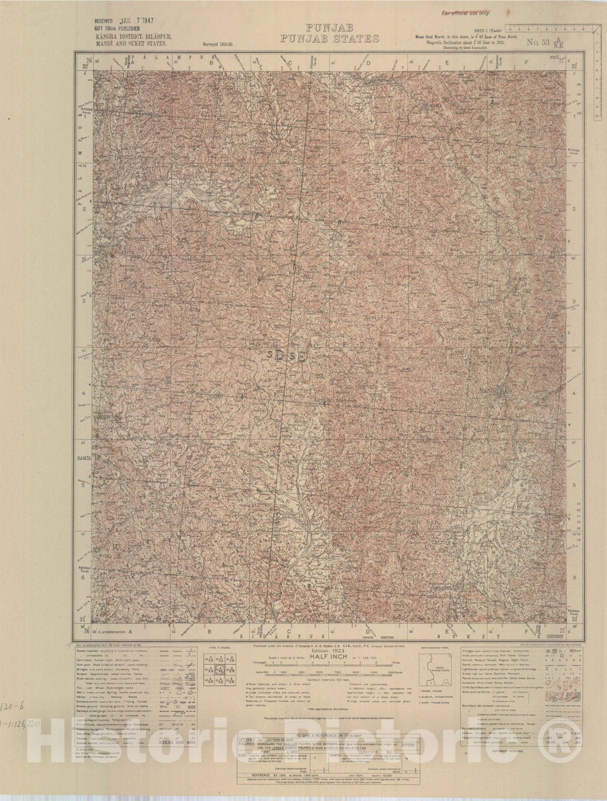 Map : Kangra District, Bilaspur, Mandi and Suket States, Punjab, Punjab States, No. 53 A/N.E. 1943, India and adjacent countries, Antique Vintage Reproduction