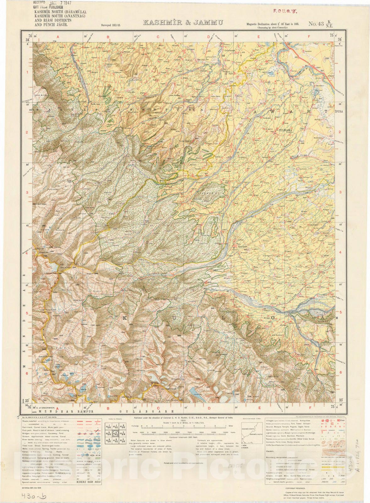 Map : Kashmir North (Baramula), Kashmir Souoth (Anantnag) and Riasi Districts and Punch Jagir, Kashmir & Jammu No. 43 K/N.E. 1939, India and adjacent countries