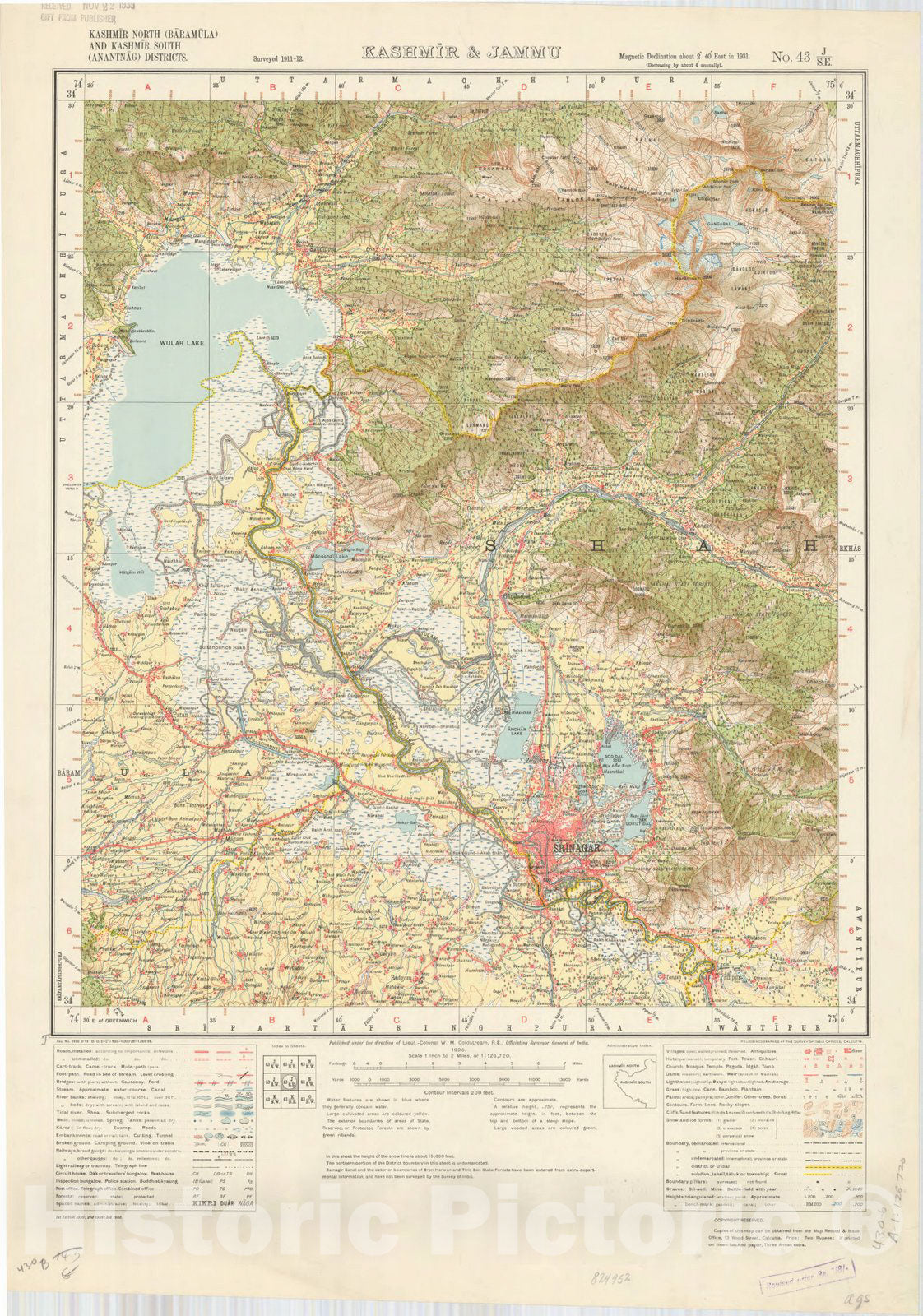 Map : Kashmir North (Baramula) and Kashmir South (Anantnag) Districts, Kashmir & Jammu No. 43 J/S.E. 1938, India and adjacent countries, Antique Vintage Reproduction