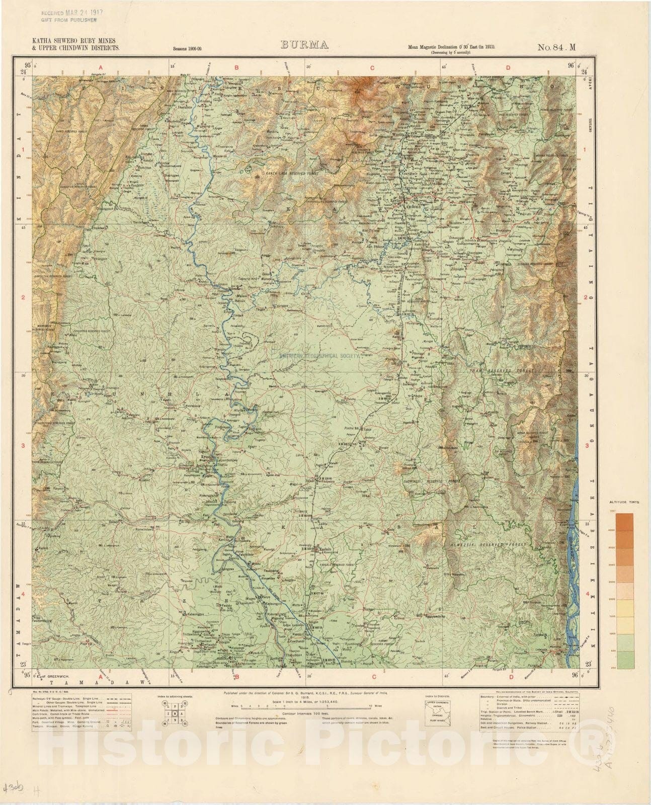 Map : Katha Shwebo Ruby Mines &Upper Chindwin Districts, Burma, No. 84 M 1915, India 1:253,440, Antique Vintage Reproduction