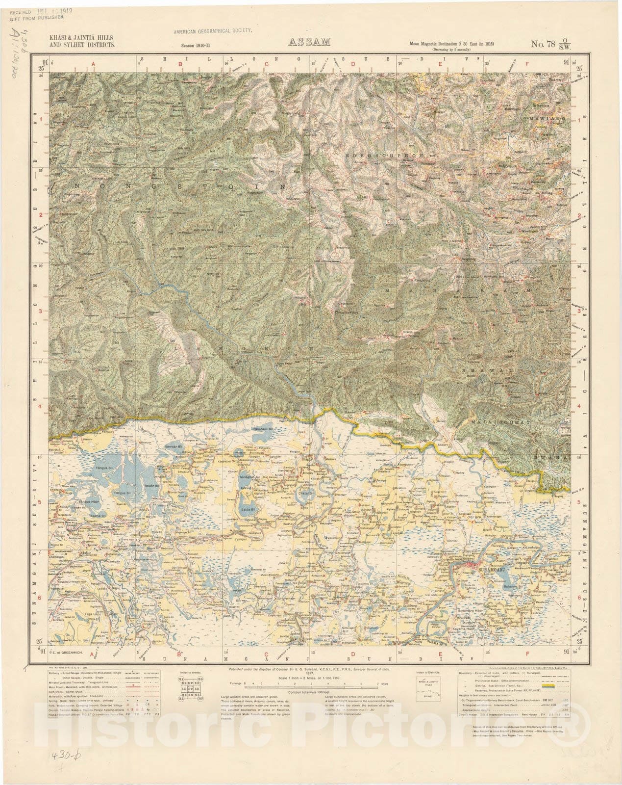 Map : Khasi & Jaintia Hills and Sylhet Districts, Assam, No. 78 O/S.W. 1917, India and adjacent countries, Antique Vintage Reproduction