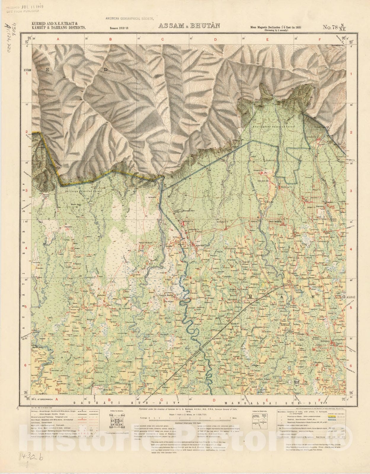 • .Map : Kurmed and N.E. F. Tract & Kamrup & Darrang Districts, Assam & Bhutan, No. 78 N/N.E. 1916, India and adjacent countries, Antique Vintage Reproduction