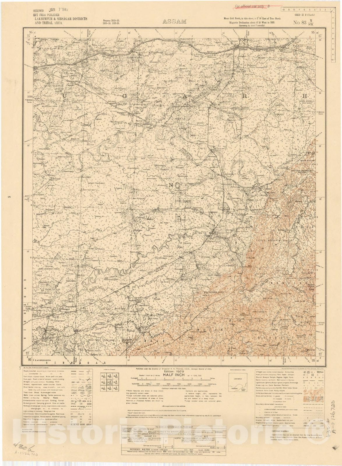 Map : Lakhimpur & Sibsagar Districts and Tribal area, Assam, No. 83 M/S.W. 1929 1943, India and adjacent countries, Antique Vintage Reproduction