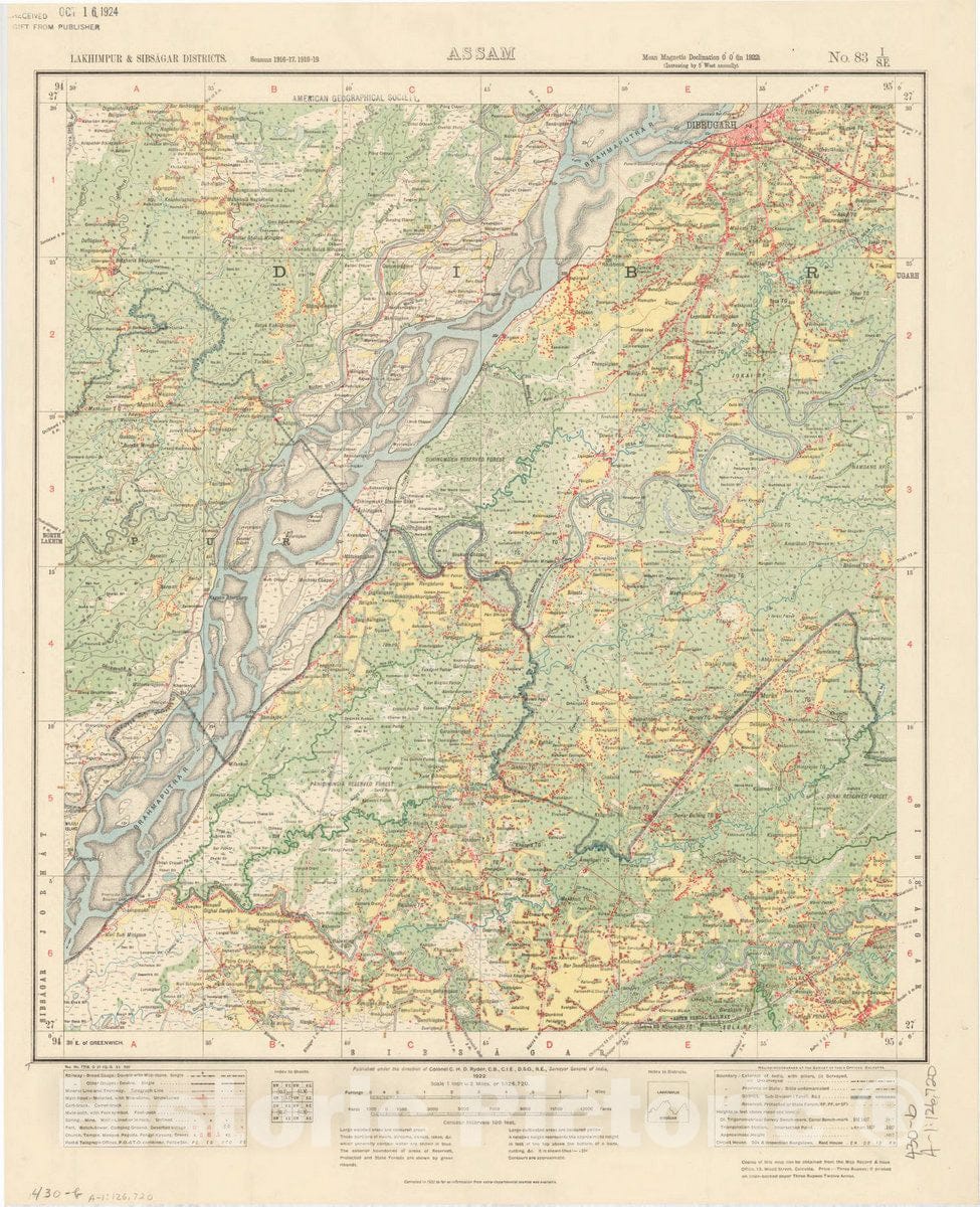 Map : Lakhimpur & Sinbsagar Districts, Assam, No. 83 I/S.E. 1922, India and adjacent countries, Antique Vintage Reproduction