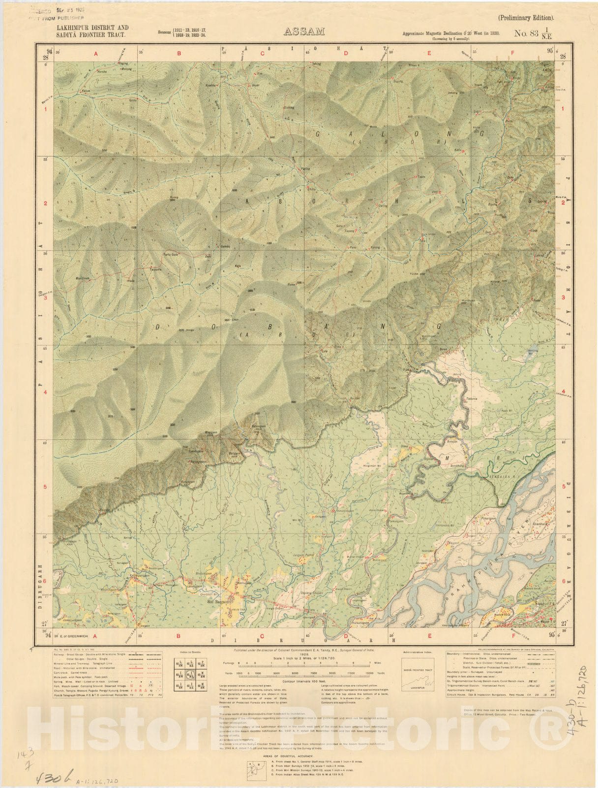 Map : Lakhimur District and Sadiya Frontier Tract, Assam, No. 83 I/N.E. 1928, India and adjacent countries, Antique Vintage Reproduction