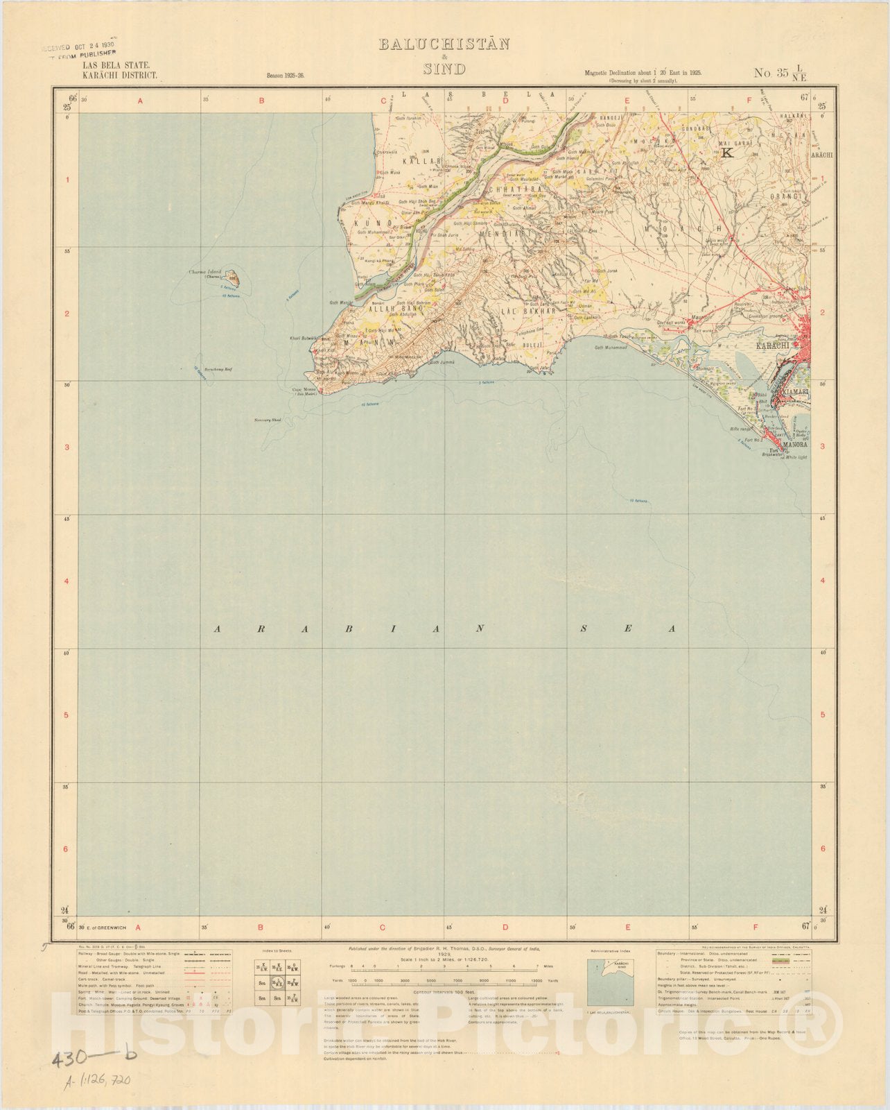 Map : Las Bela State, Karachi District, Baluchistan & Sind, No. 35 L/N.E. 1929, India and adjacent countries, Antique Vintage Reproduction