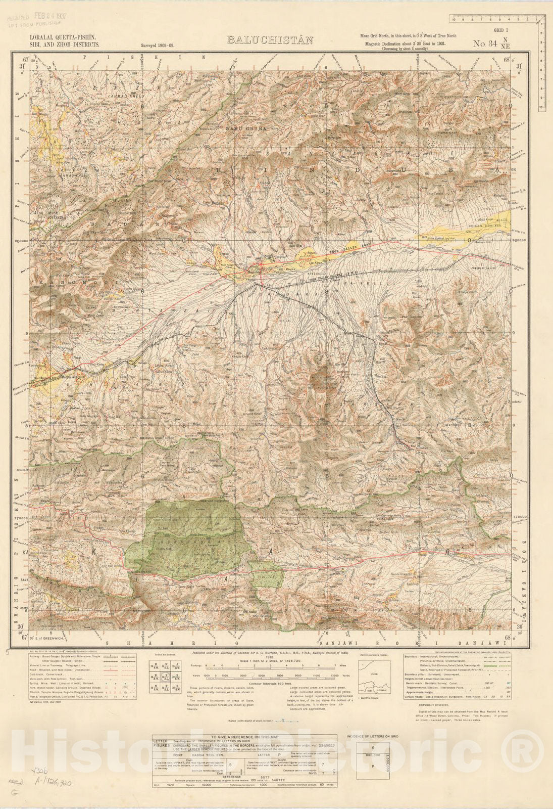 Map : Loralai, Quetta-Pishin, Sibi, and Zhob Districts, Baluchistan, No. 34 N/N.E. 1932, India and adjacent countries, Antique Vintage Reproduction