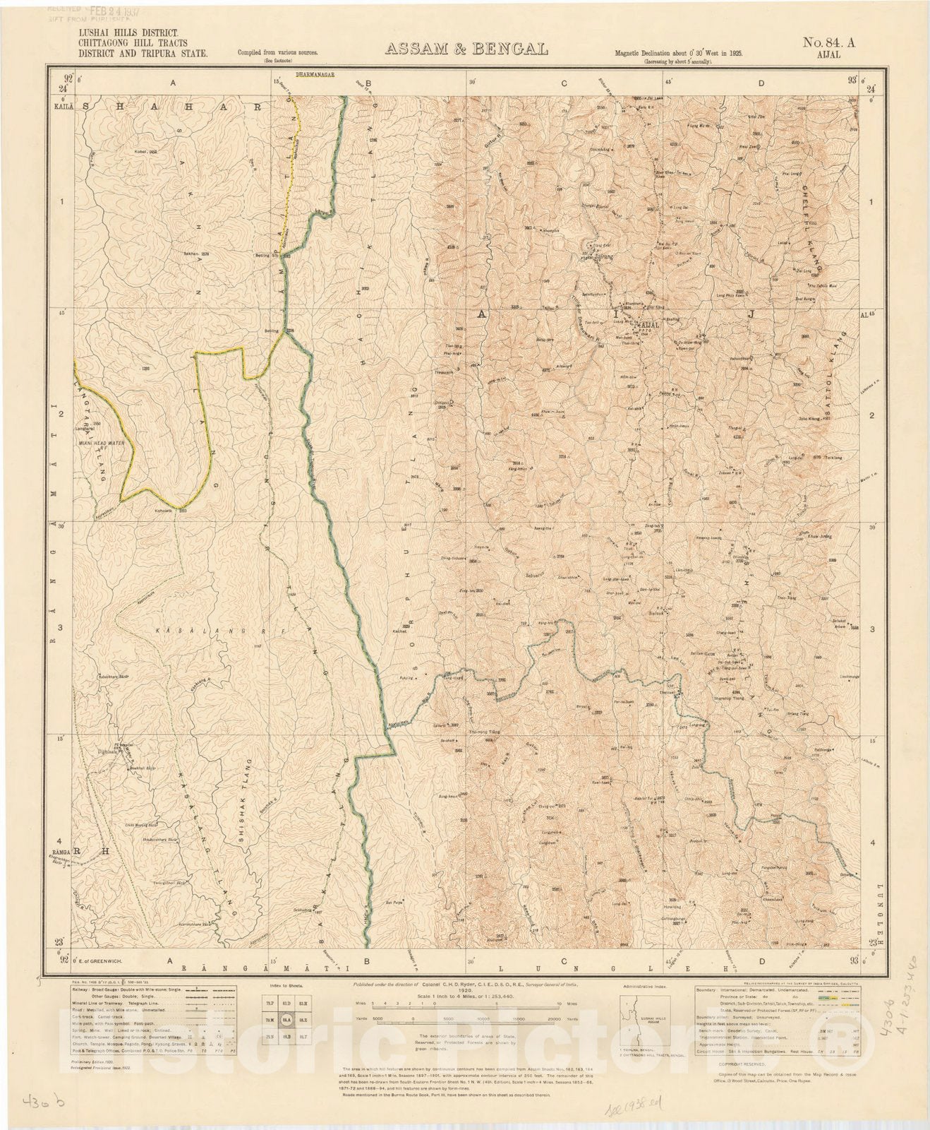 Map : Lushai Hills District, Chittagong Hill Tracts, District and Tripura State, Assam & Bengal, No. 84 A Aijal 1933, India 1:253,440, Antique Vintage Reproduction